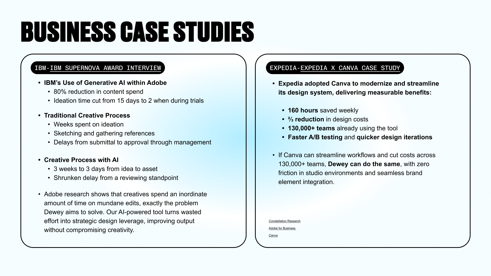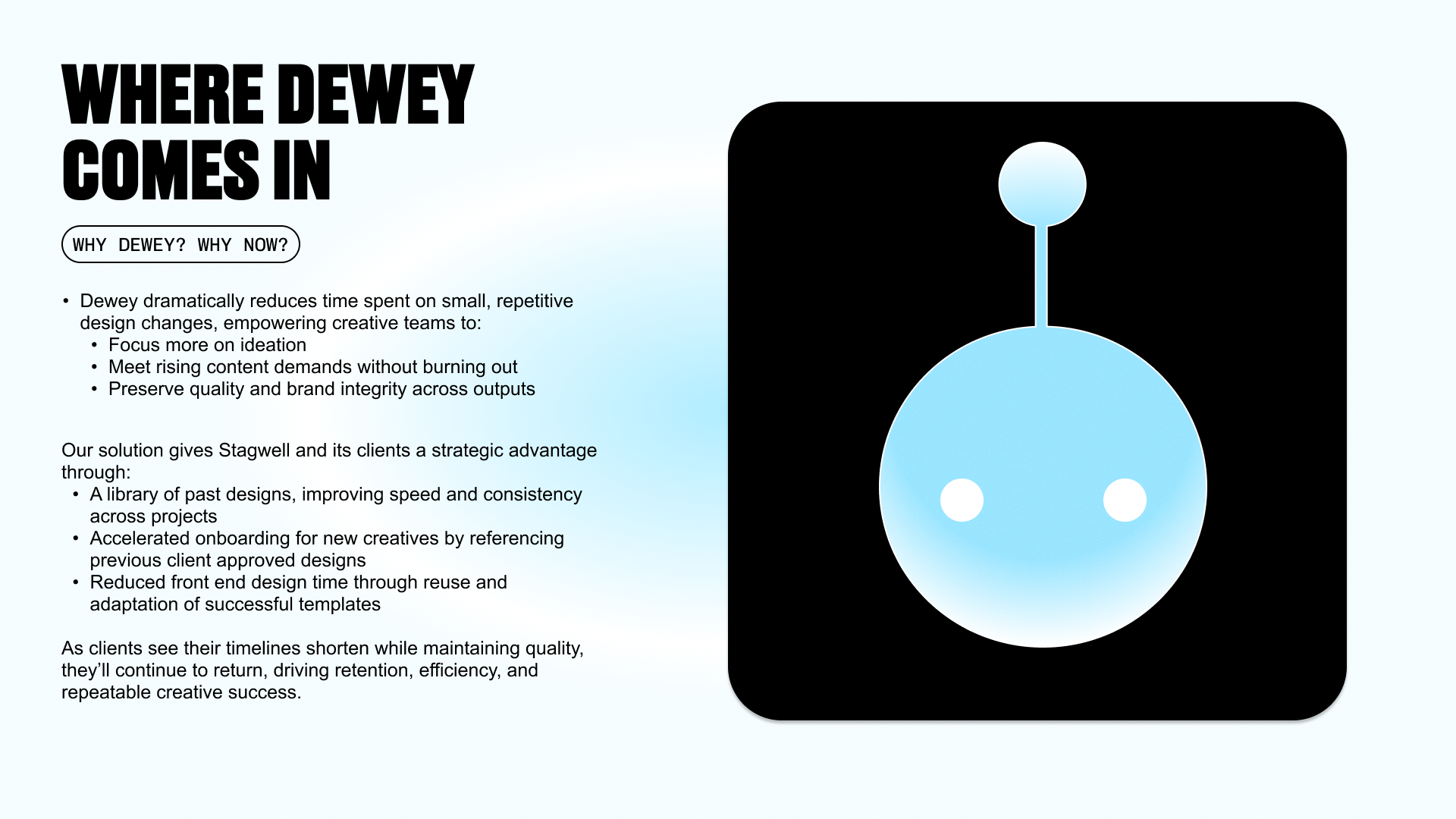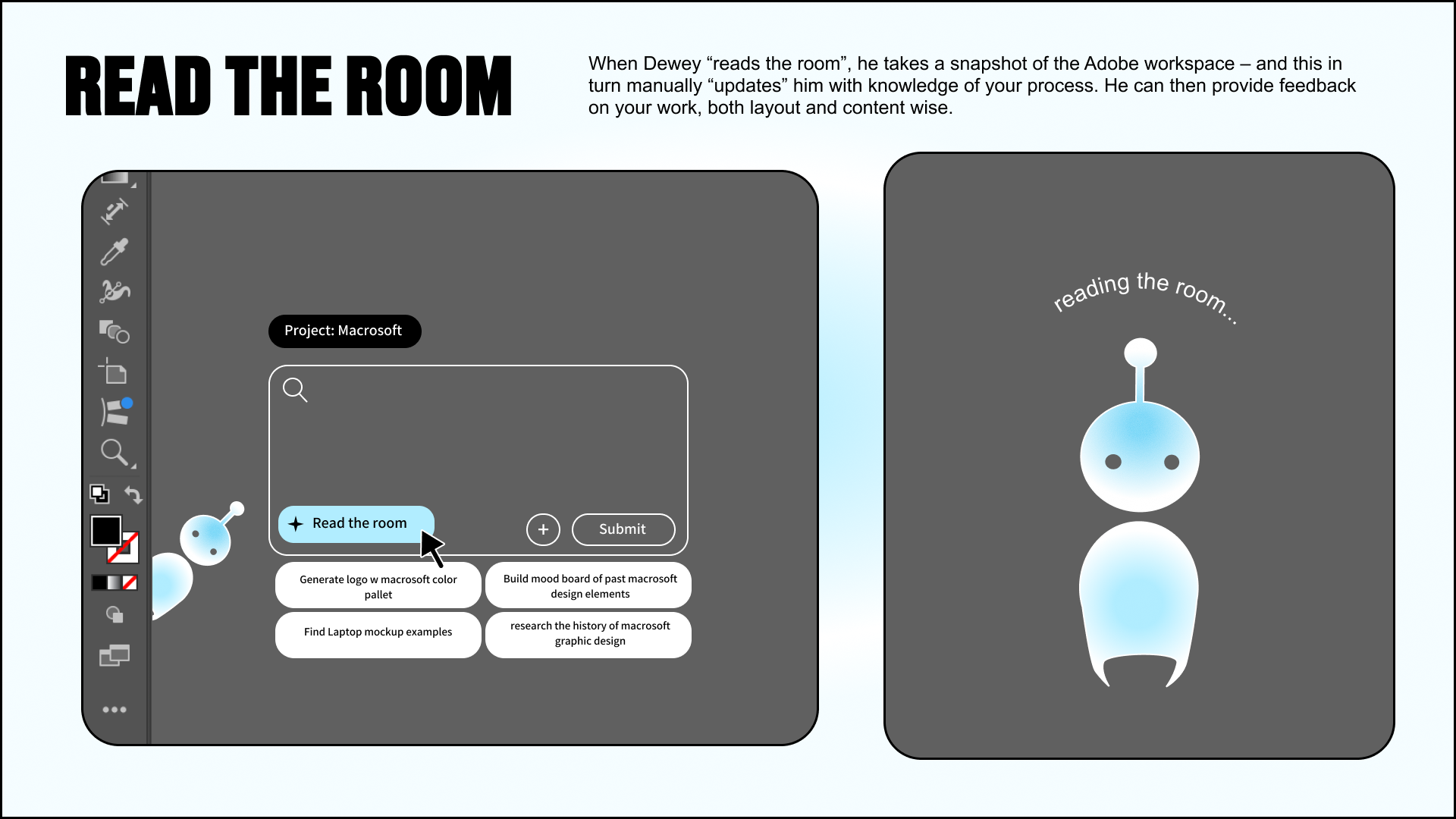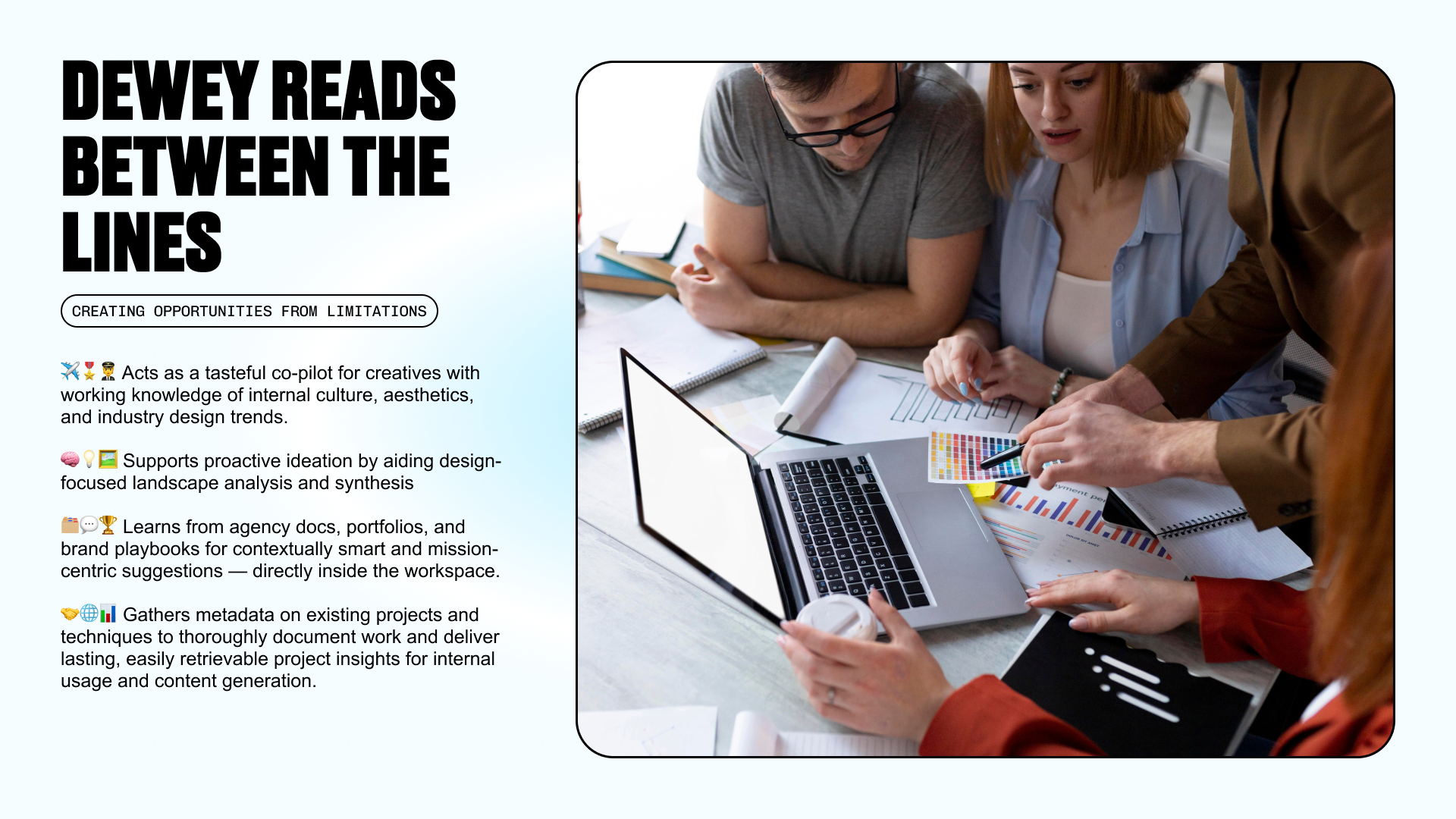Meet Dewey:Dewey is an AI agent plugin for the Adobe Creative Suite that brings the library-state-of-mind to creative professionals. he’s an in-workspace guru that stewards over archival materials and industry trends to provide the most forward-thinking suggestions. No matter where you are in the Adobe Creative Suite, Dewey waits for you by your toolkit—always ready to pull insights on previous projects, source relevant case-audits and analogues for landscape analyses, and facilitate productive brainstorming.