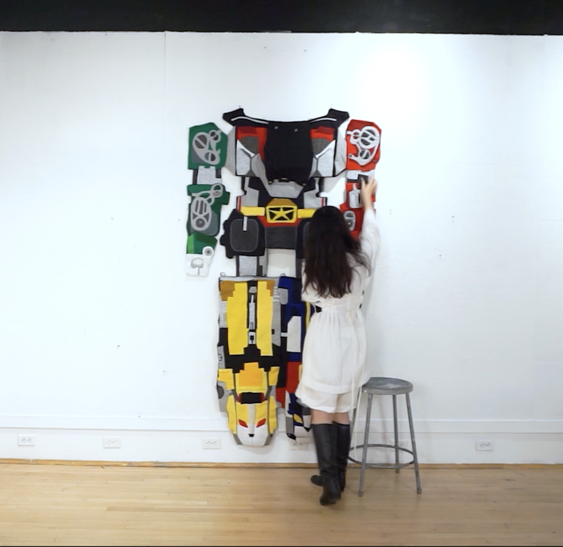 This large-scale, hand-stitched tapestry begins as a life-sized “cash cow” and transforms into an eight-foot-tall Voltron. The transformation process intends to provoke thoughts on the relationship between representation and consumption, displaying how we perceive and engage with cultural symbols; displaying the relation between American Consumerism and the consumption of East Asian symbology.