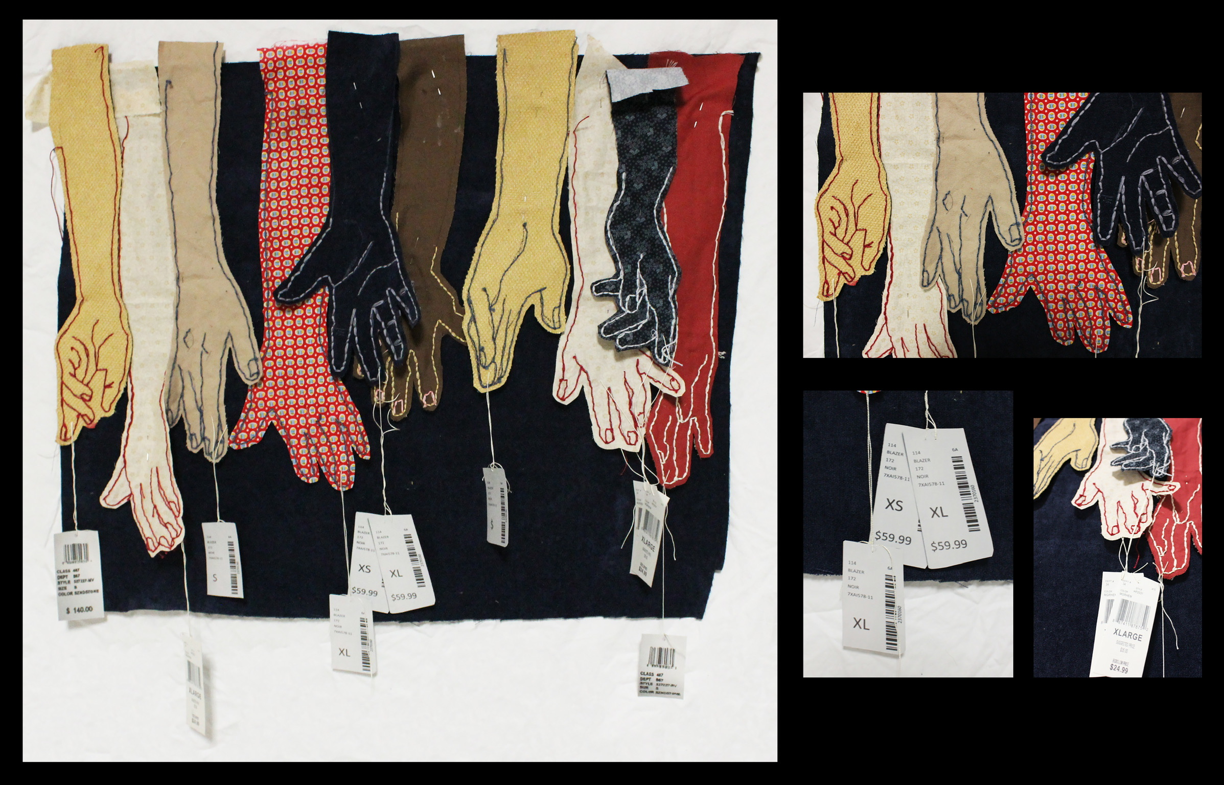 I created a series of mixed media works depicting the lives of children affected by harsh child labor practices. Much of this piece uses upcycled fabric sewn onto canvas. I wanted to make a commentary on children made to work using materials and products that were created by child labor. The three children look out onto the world where they live, surrounded by the factories that employ them. I stitched their clothing and surroundings out of fabric to show how their lives are dependent on this industry and also depict their brutal work atmosphere. Their faces express emotion and show that when companies dehumanize the lives of children, kids are emotionally and physically harmed and should be prioritized.